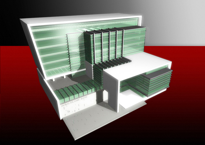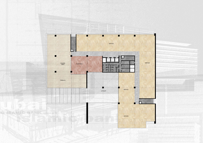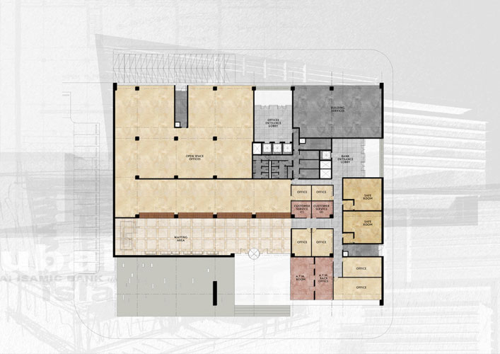 The concept is based on creating an urban space between the building and the adjacent road. This urban space is inviting the bank customers to the bank headquarter. There is a separation between the bank headquarter and the rented office spaces which is reflected on the mass composition. |