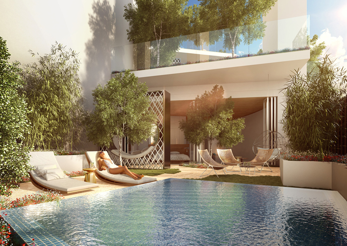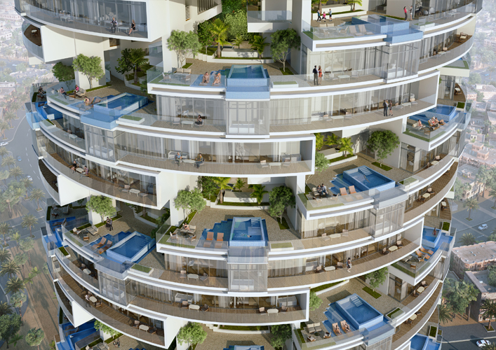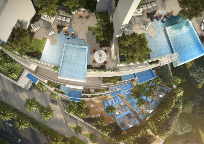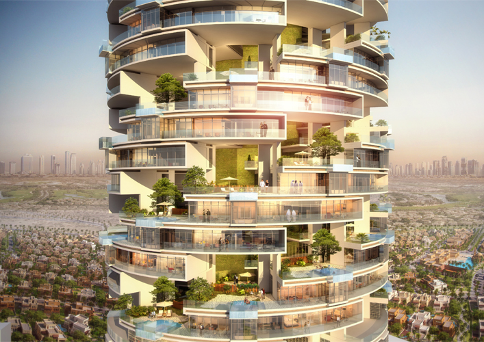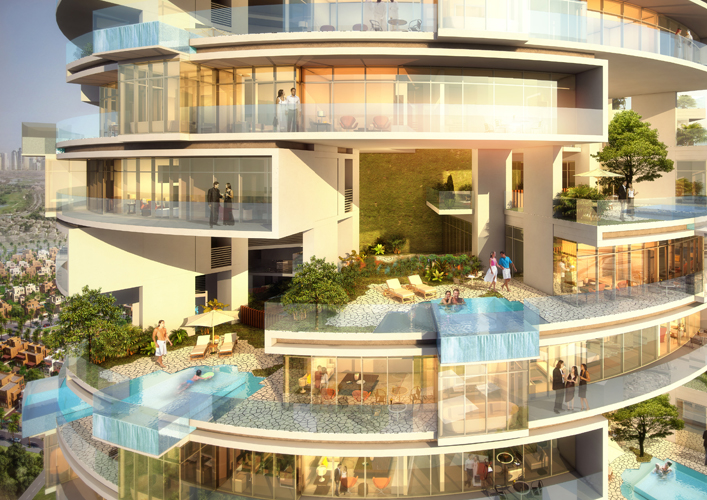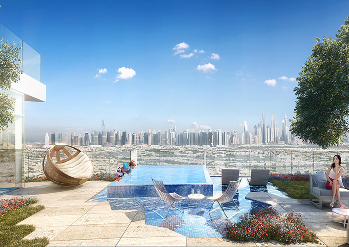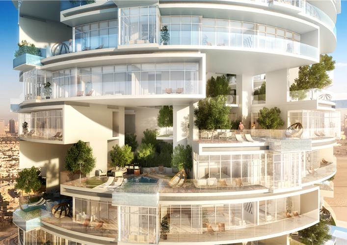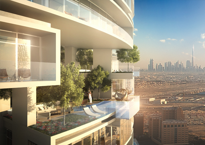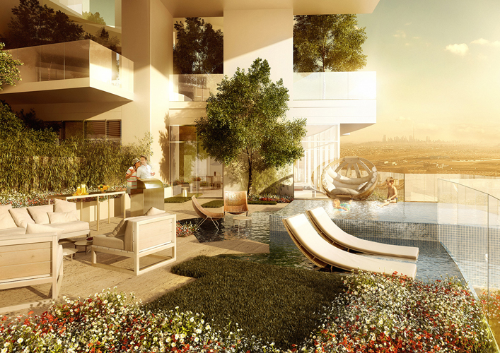 “Five Jumeirah” project, a 60 storey tower located in the heart of a Jumeirah village, this project is considered a vertical representation of that horizontal residential community adding the value of a 360 degree panoramic view of Dubai’s horizon. This project, in addition to its panoramic view, offers a unique experience of sky gardens. Each sky garden has a private swimming pool for one 3 bedroom apartment. |
