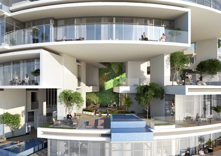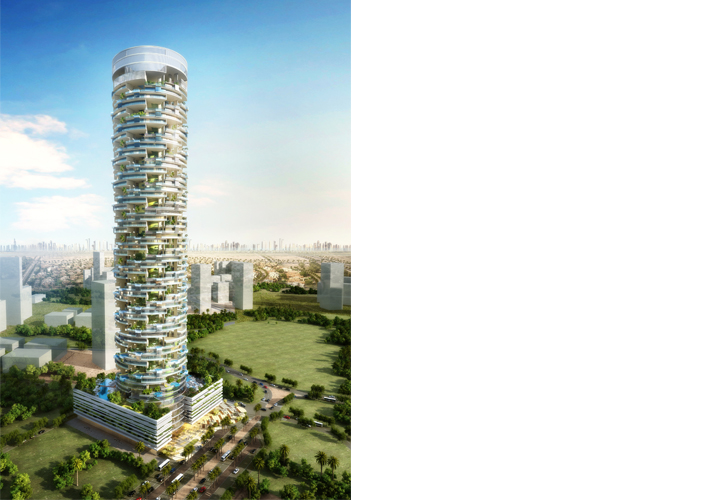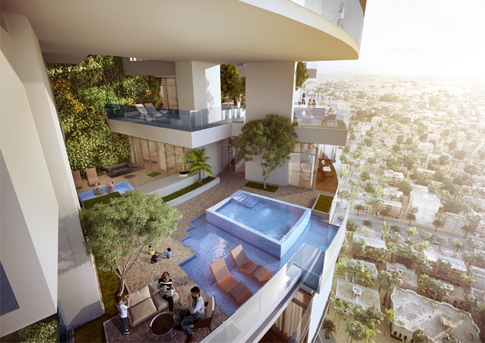 The integration of the sky gardens into high rise towers and creating community spaces for skyscrapers which lack such social dimension. The overall landscaped areas reach 7 times the plot area of the project. The use of the building geometry and its twisted floor plans to allow for prevailing winds to cool the building to create comfortable outdoor living spaces. |