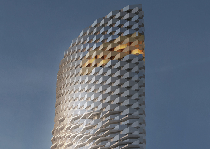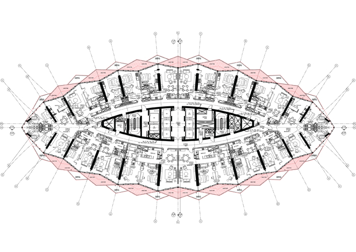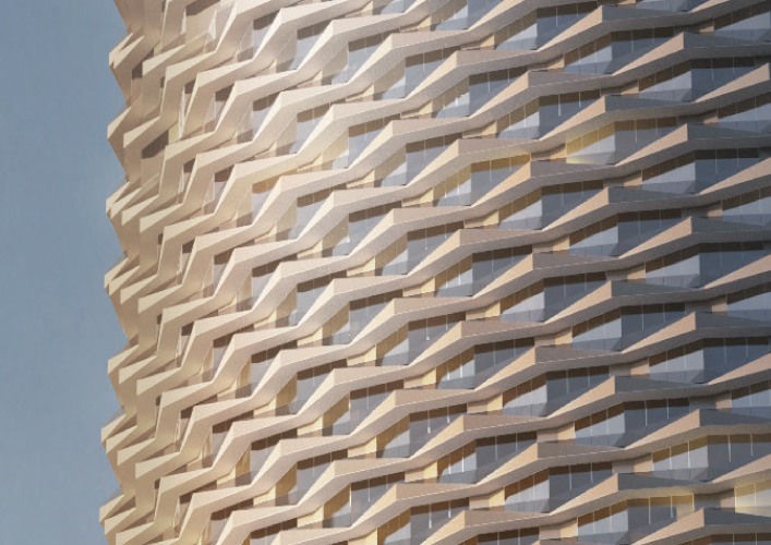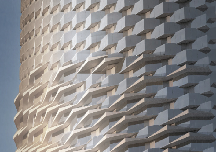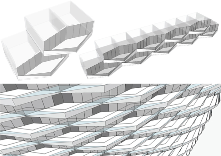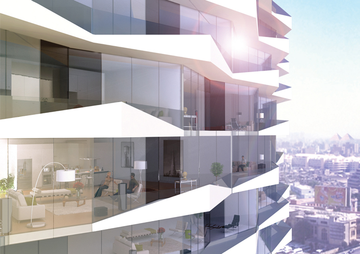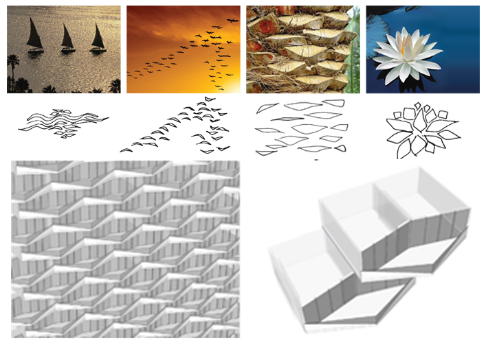 Patterns formed for this project is derived from; The River Nile, Benu Birds, Egyptian Palm Trees and the White Egyptian Lotus Flower.The patterns evolved through a series of design exercises that derived from the ‘Egyptian Nature’ concept. The design is made up of three key components. The first, is the weave that interconnects between floors; The sofit is sculpted into a diamond shape to give the second layer of the skin. Finally, the balconies are a continuation of the first component and accentuate the dynamic form of the weave |