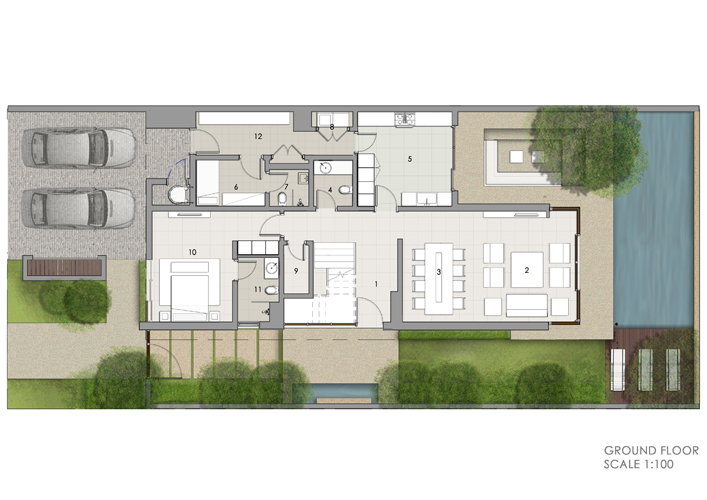 Open plan house with an overview to the back yard garden. Modern contemporary architecture. |