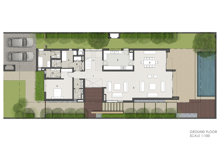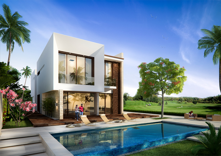 Contemporary and modern architecture for golf course house. A large back yard and a private swimming pool. |