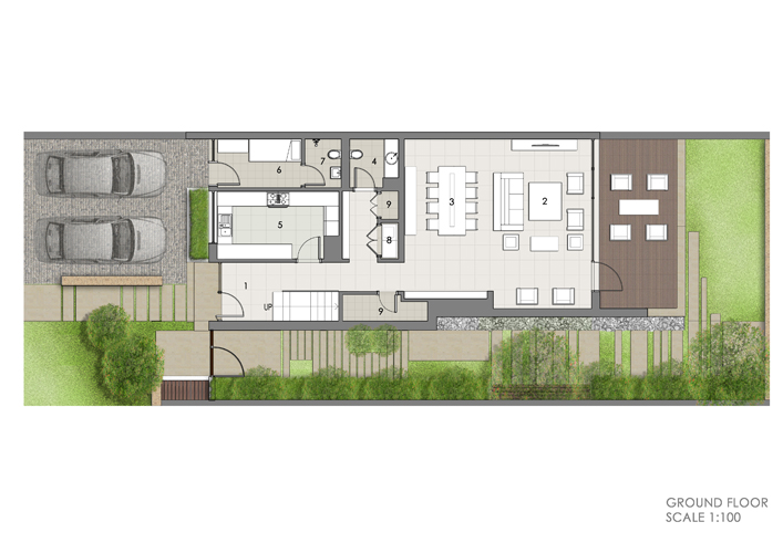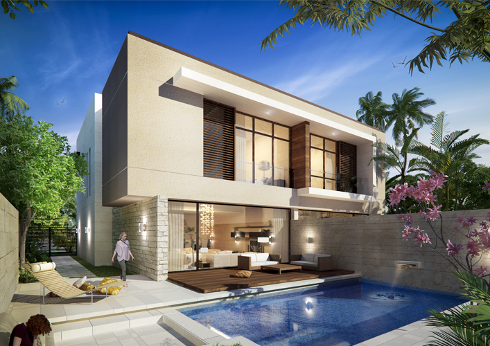 Contemporary and modern architecture for golf course house. A large back yard and a private swimming pool. |