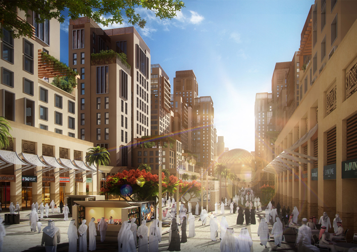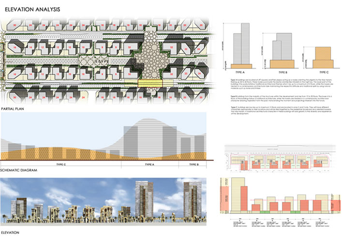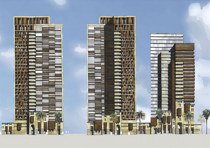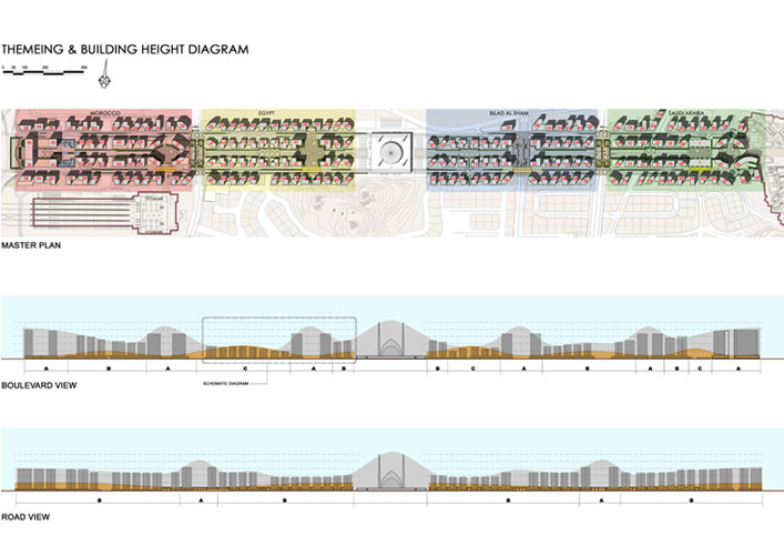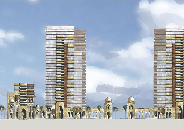 The visioning concept of this project is based on dividing the development into four complementary zones each with a different Arabic style starting with Morocan, egyptian, syrian and Saudi style. Within each zone the buildings are classified within three categories that vary in height from 40 to 15 floors. The mix between the contemporary and traditional architecture and the harmony of distributing the heights of the buildings create the visioning character of this development. |