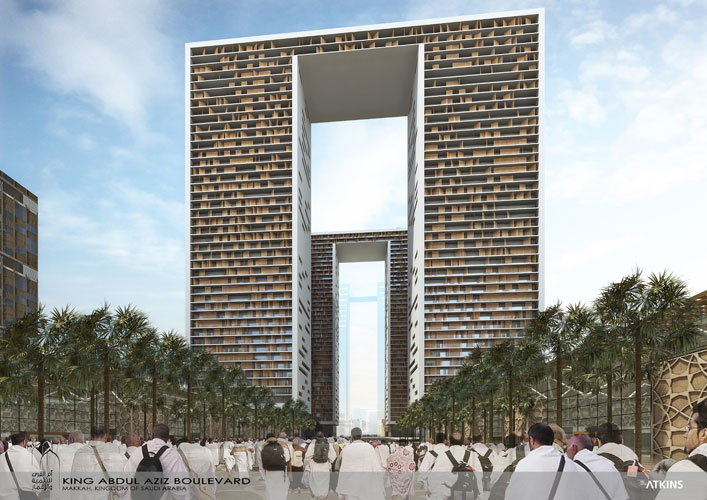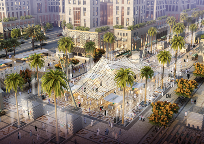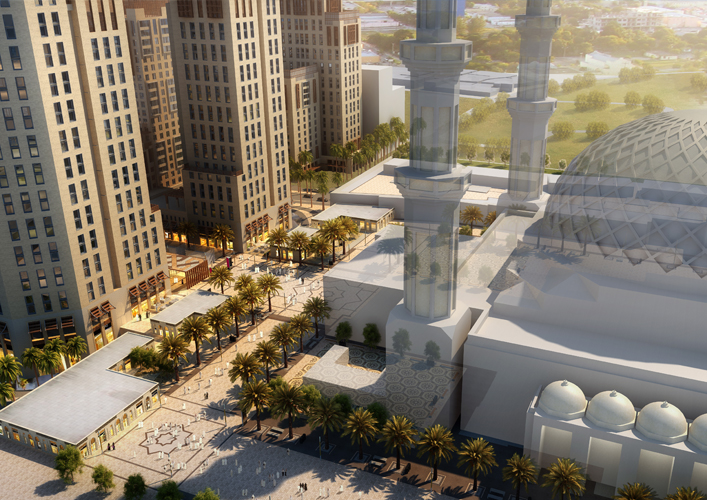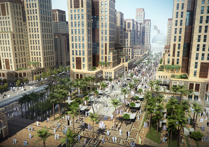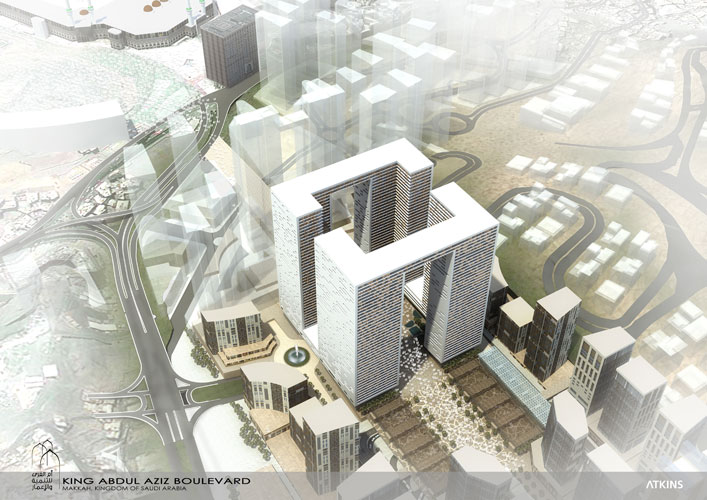 The King Abdul Aziz Road (KAAR) project lies directly on Makkah's western approach and stretches from the third Ring road intersection with Umm Al Qura Road to the Jabal Omar development just west of the Haram. the centrepiece of the KAAR development is a grand pedistrian boulevard of up to 60m in width flanked on both sides by hotels and residential apartments. The development will stretch roughly 3.65 kms with an average width of 320m. |