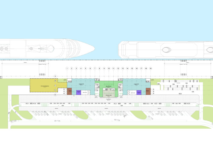 8000 pasengers cruise terminal, 3000 sq.m. luggage store, 2400 waiting seats, 20 emigration counters, 85 cruise line counters, services and facilities. |